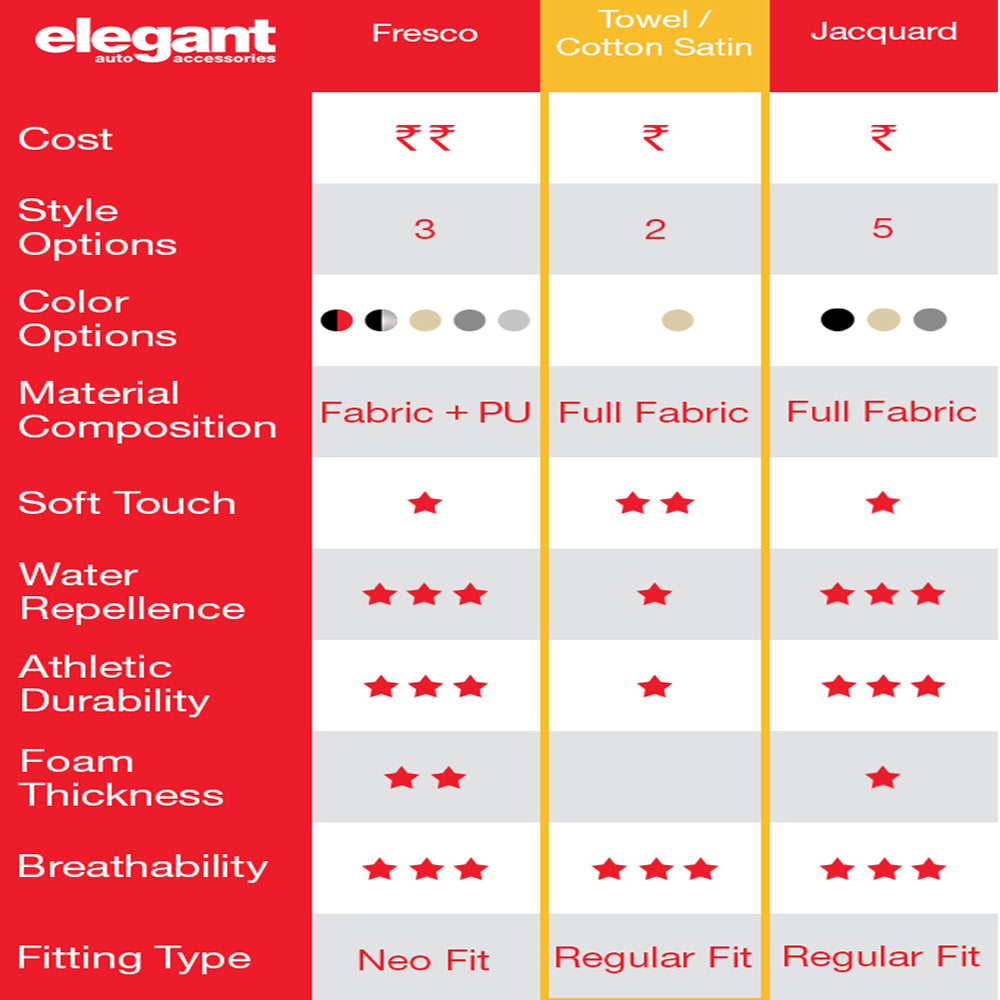 Inspired from Formula 1 race cars, F1 seat covers come with bright color combinations. Now enjoy comfort of cool car seats while giving your car an electric sporty look. For the first time in fabric seat covers, you can add bright colors and sporty looks to your car interiors at reasonable price. Made from carefully chosen jacquard fabrics treated with NANO chemicals to resist stain, dust, dirty shoes, food and cola spills.